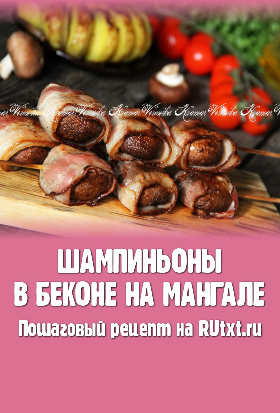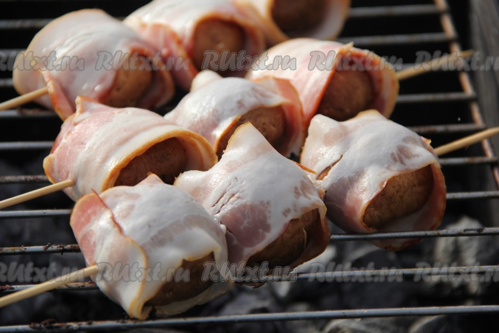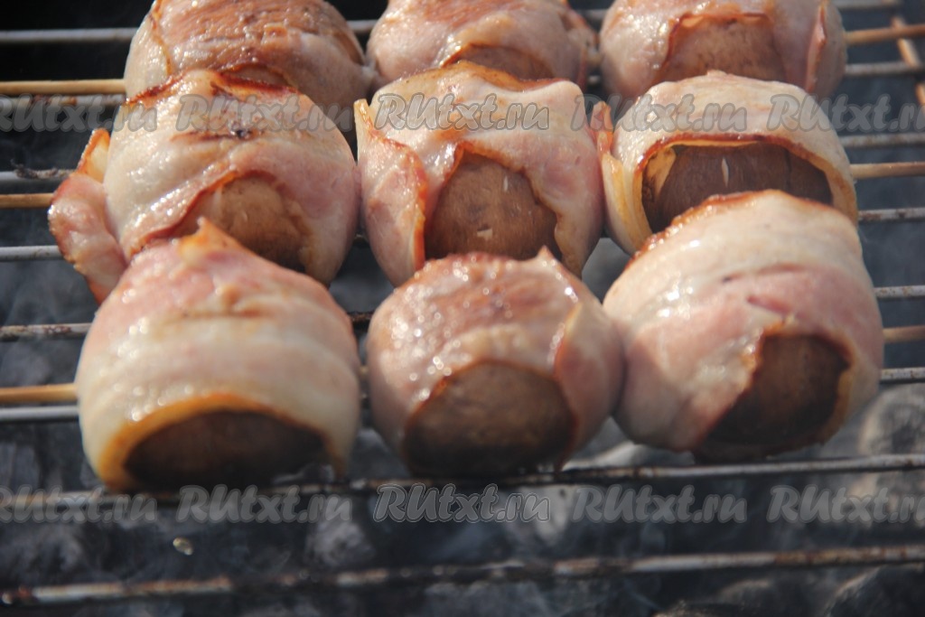 Жарить шампиньоны в беконе с двух сторон на седых углях (без открытого огня), примерно, по 2-3 минуты с каждой стороны. Бекон должен подрумяниться.