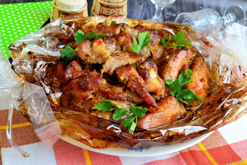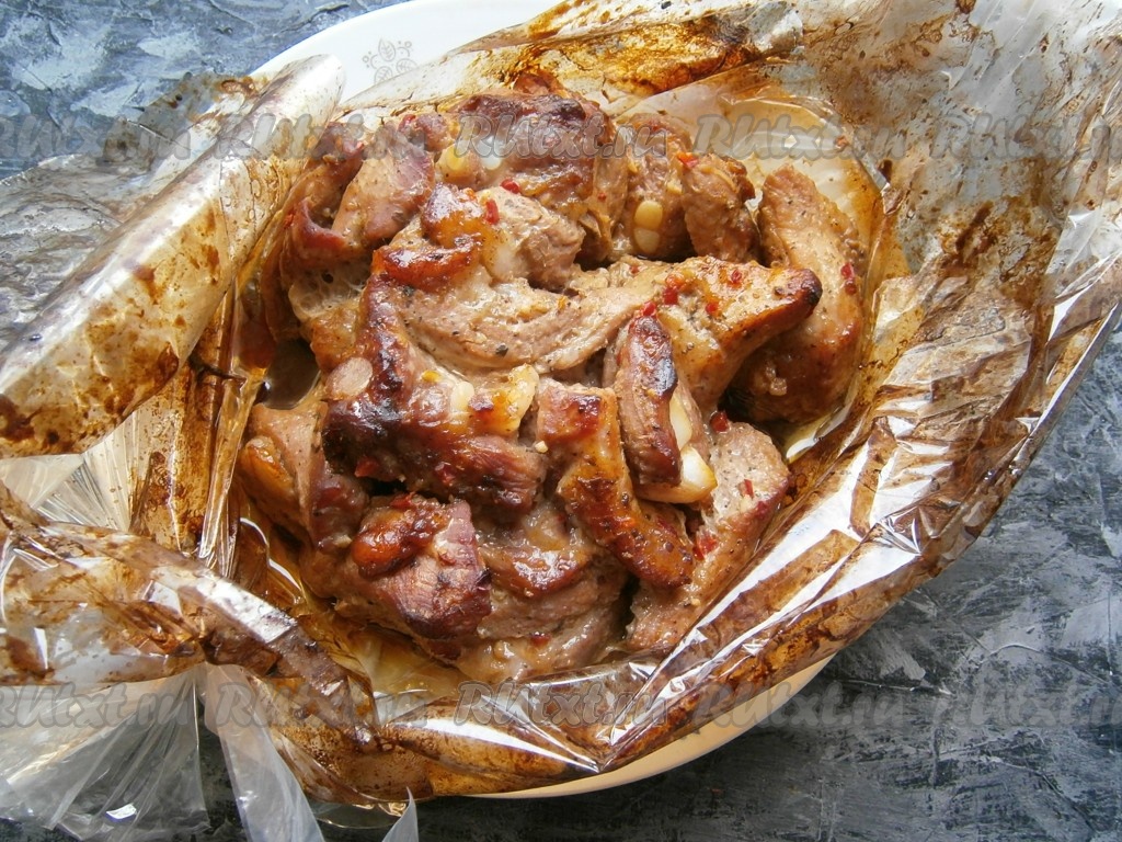 Тщательно ещё раз перемешать, оставить на 2-3 часа при комнатной температуре. После этого свиные рёбрышки сложить в рукав для запекания, концы которого крепко зафиксировать с двух сторон.