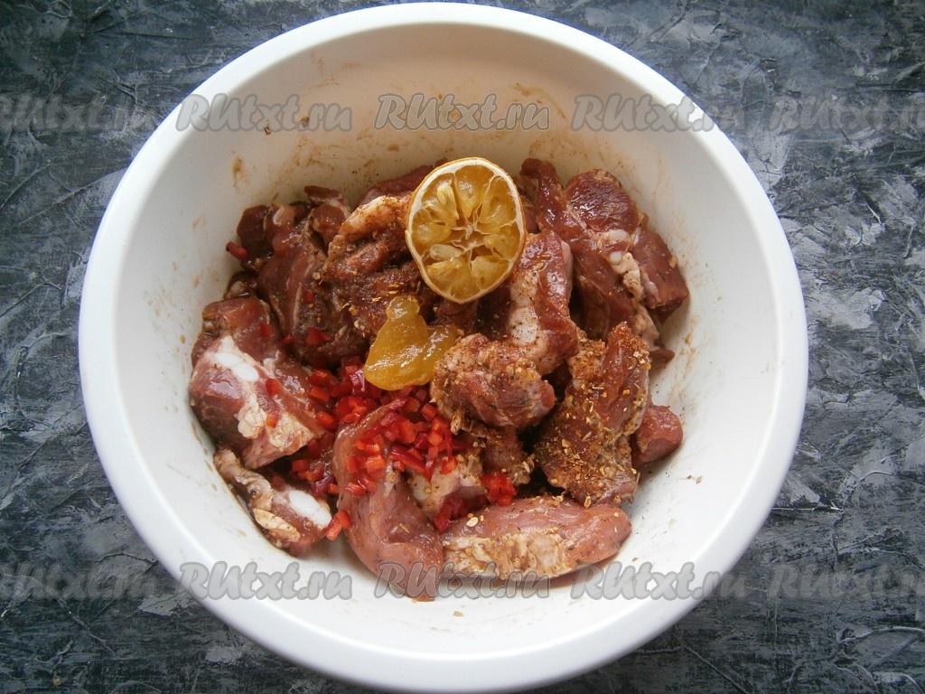 Сюда же добавить мелко нарезанный перец чили, мёд и выдавить из лимона сок.