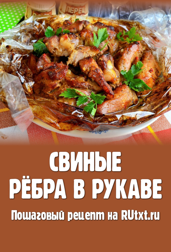 Переложить рукав на противень для запекания, сверху на рукаве сделать несколько проколов шпажкой (или зубочисткой) для выхода пара. Готовить свиные рёбра в разогретой до 180 градусов духовке около 1 часа 15 минут. По окончании запекания рукав аккуратно (чтобы не ошпариться) разрезать.