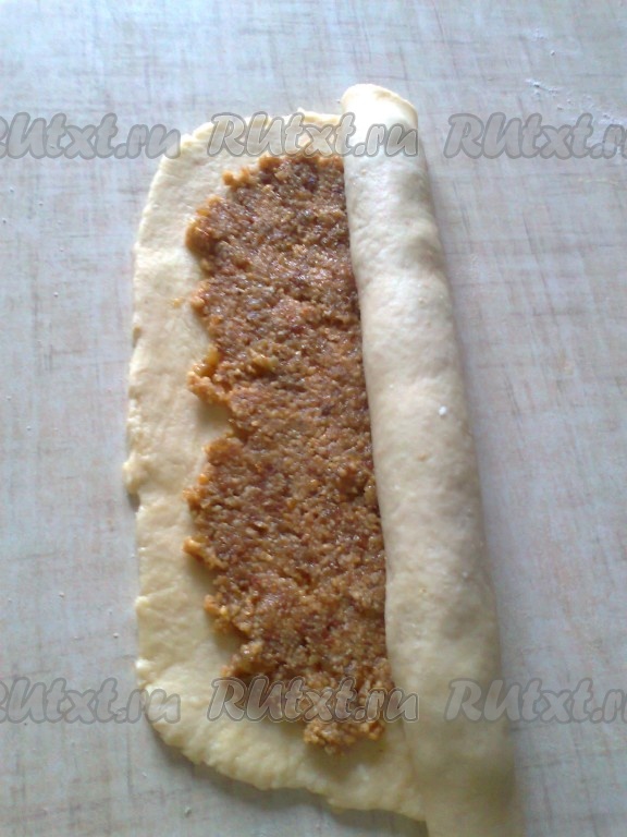 Выкладываем ореховую начинку на раскатанное тесто (к начинке можно добавить ромовую или миндальную эссенцию), оставляя чистыми по 1-2 сантиметра от краёв со всех сторон теста.