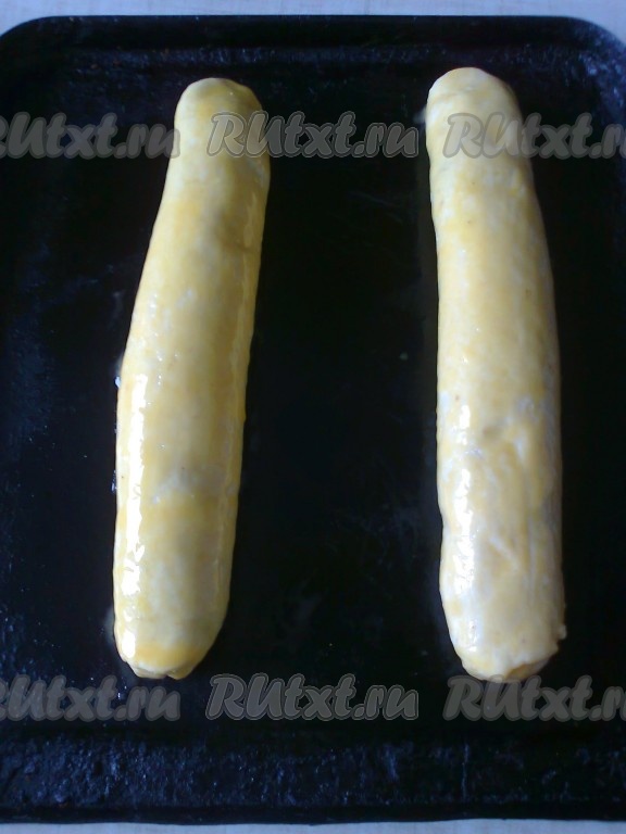 В небольшой ёмкости яичный желток взбиваем вилкой до однородности. Поверхность рулетов смазываем взбитым желтком.