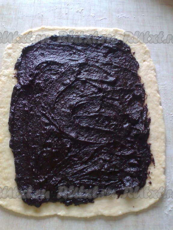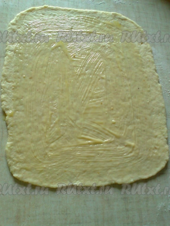 Аналогично раскатываем второй шар из творожного теста. Тесто для рулета с шоколадной начинкой смазываем отложенным растопленным маслом.