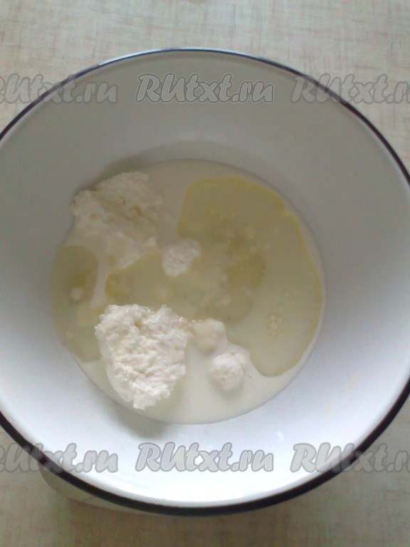 Замесим тесто, для этого в миску вольём подсолнечное масло, молоко, добавим творог, сахар, соль, ванилин.