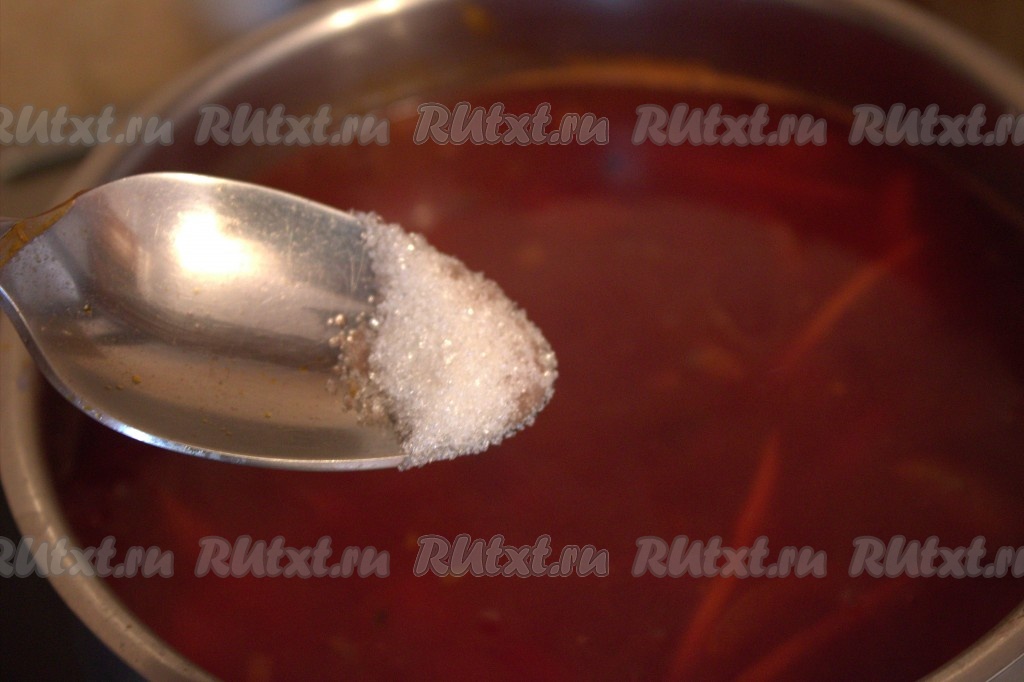 Сразу же в свекольник с курицей добавить уксус и сахар.