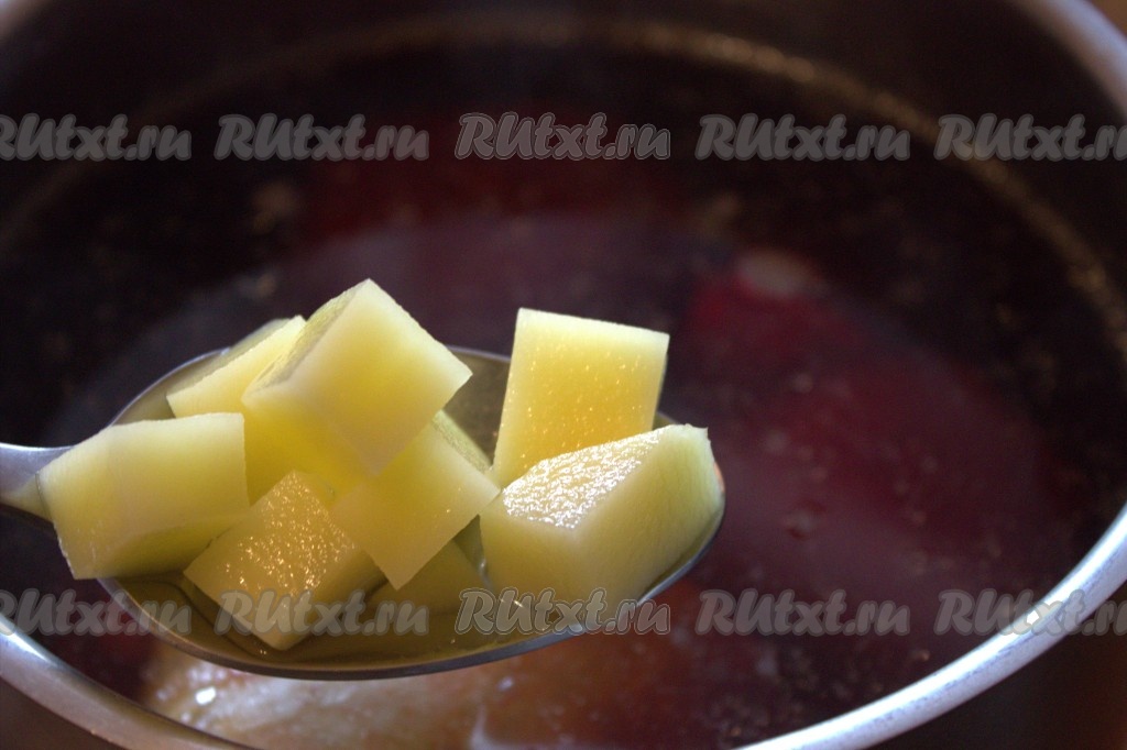 Затем добавить в суп нарезанную варёную свеклу.