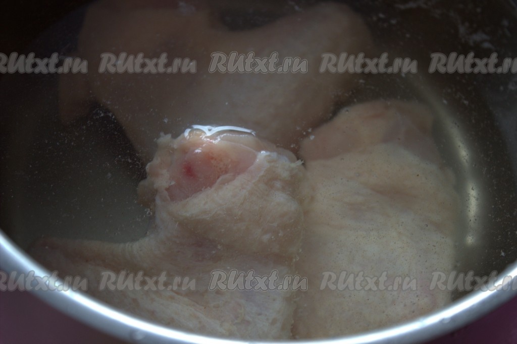 Сразу же выложить в кастрюлю куриное мясо, отделённое от костей.