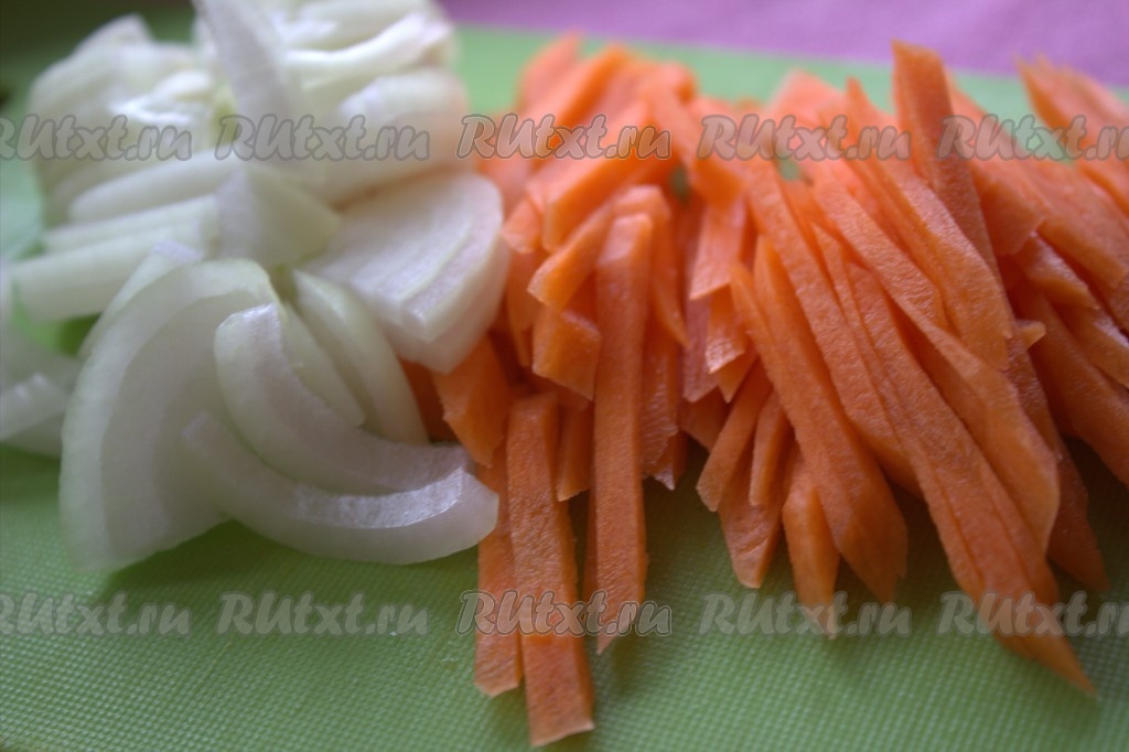 Пока варятся свекла и курица, мы подготовим другие составляющие нашего горячего свекольника. Прежде всего нужно очистить и нарезать полукольцами репчатый лук. Морковь очистить и нарезать тонкими брусочками.