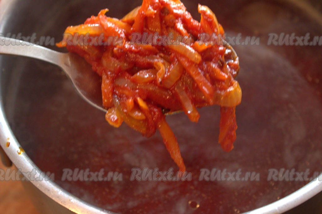 Когда свекла и картошка будут полностью готовы (свекла должна легко прокалываться вилкой), достать свеклу из бульона, дать ей остыть и нарезать на тонкие брусочки. В кастрюлю с бульоном и картошкой добавить обжаренные с томатной пастой лук и морковь.