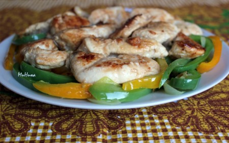 Подавать куриное мясо, приготовленное в медово-горчичном соусе, можно с рисом или каким-либо овощным гарниром. Здесь подача на перцах пиперада.