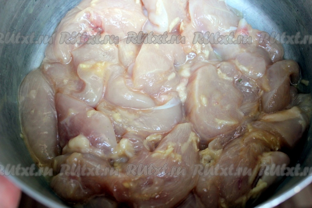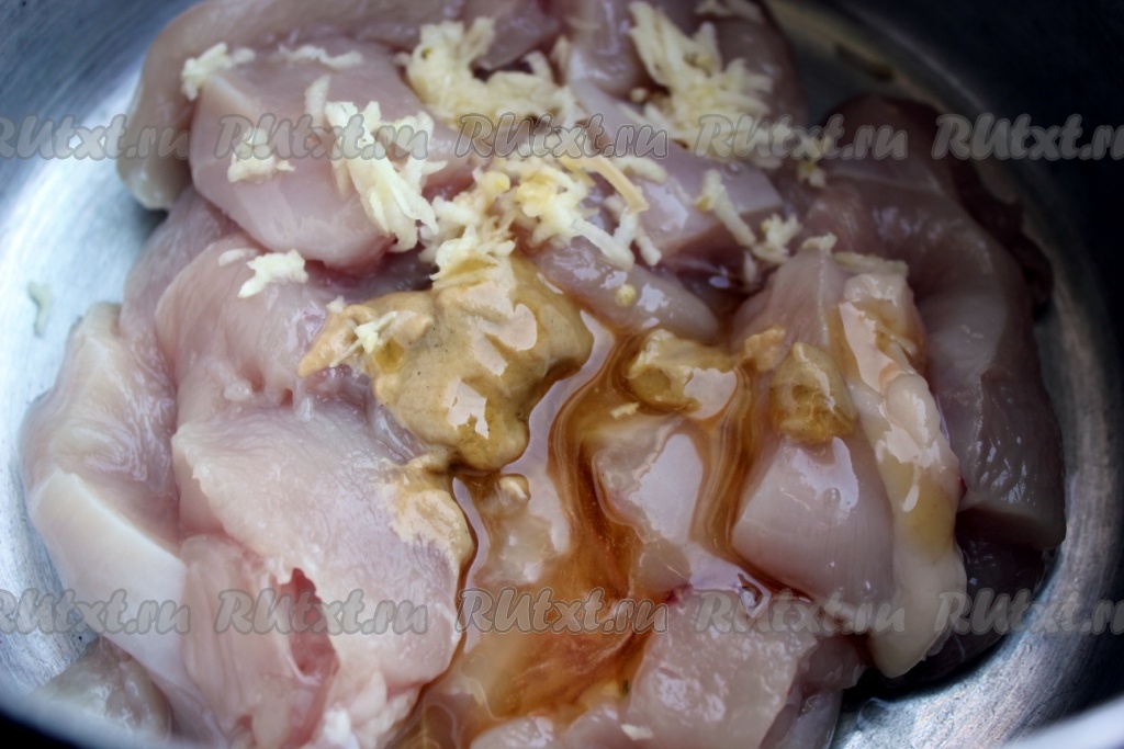 Куриное филе нарезать на кусочки, положить в кастрюльку или миску и добавить оливковое масло, мёд, горчицу и измельченный чеснок.
