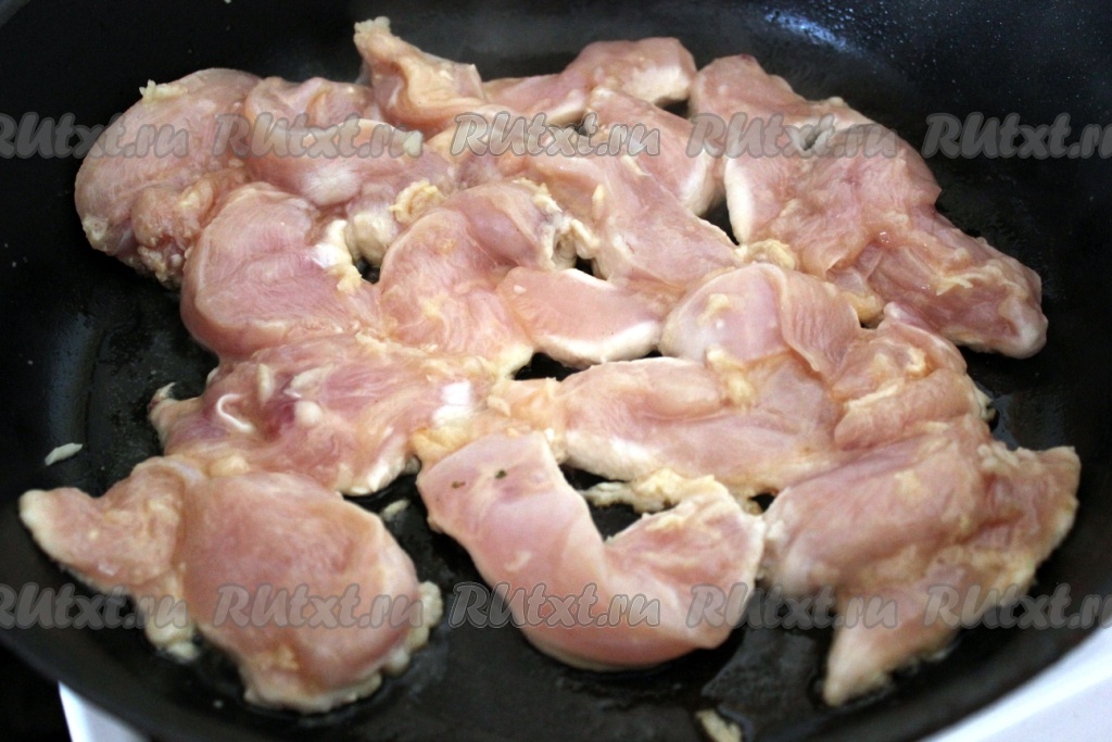 Затем куриное мясо посолить, оно уже в оливковом масле, поэтому сковороду можно не смазывать маслом или добавить его совсем чуть-чуть. Обжарить курицу минут 15 - 20, переворачивая кусочки.