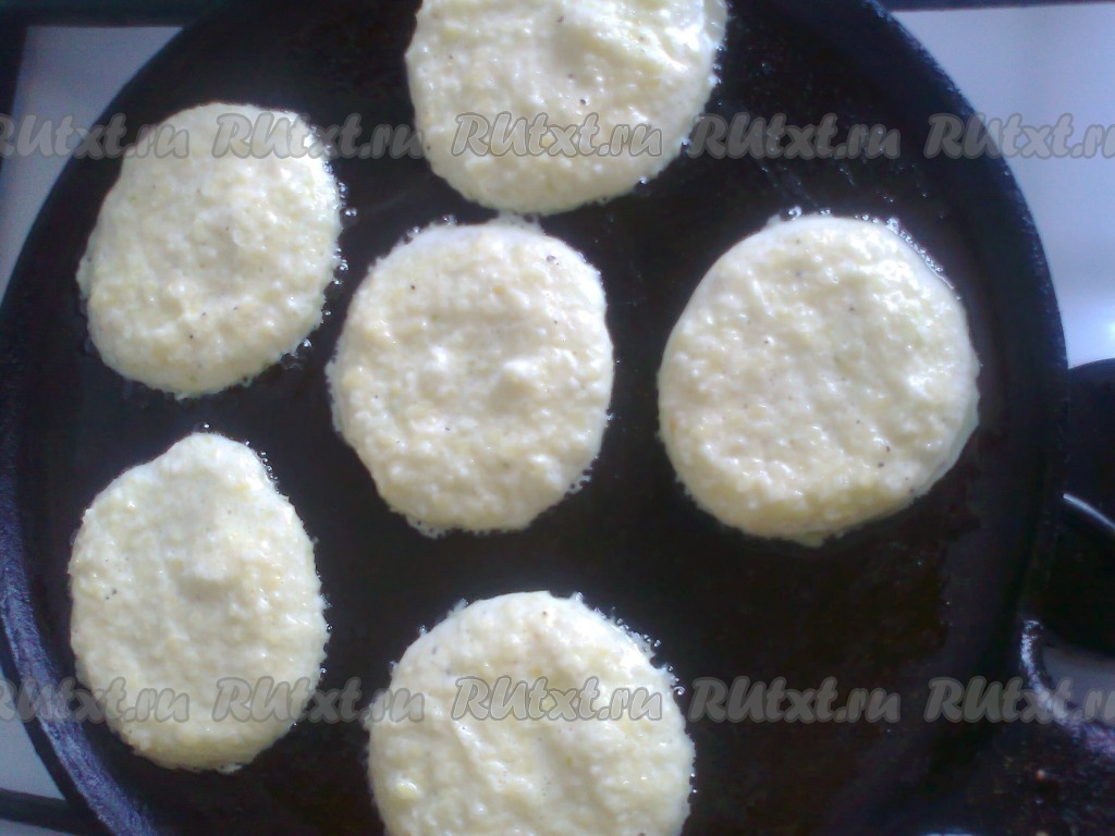 Влить растительное масло на сковороду, разогреть. Выкладывать измельчённую массу столовой ложкой, как оладьи.