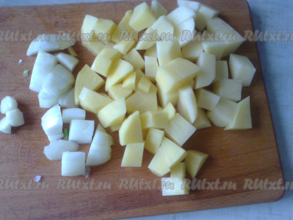 Картофель, чеснок и лук очистить и нарезать на небольшие кусочки.