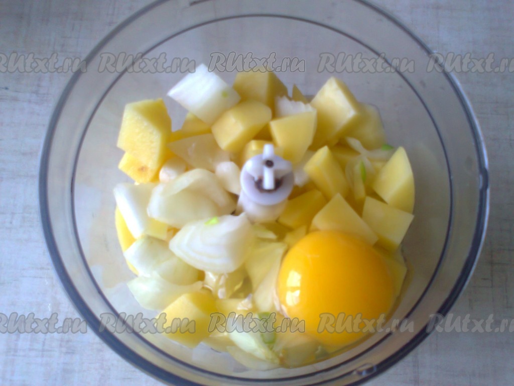 Выложить нарезанные картошку, чеснок и лук в чашу измельчителя (блендера), добавить яйцо, посолить и поперчить.