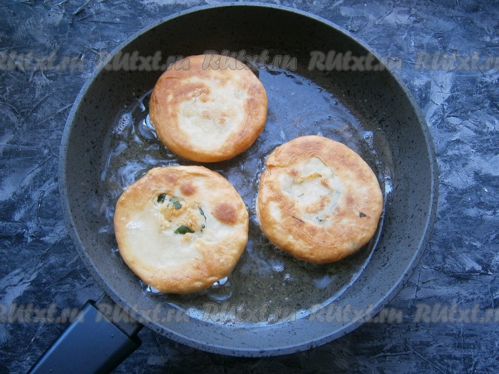 Готовить пышки с сыром и зеленью на сковороде на среднем огне до румяности с двух сторон. Жарятся они достаточно быстро, увеличиваются в размере, становятся пышными и воздушными.