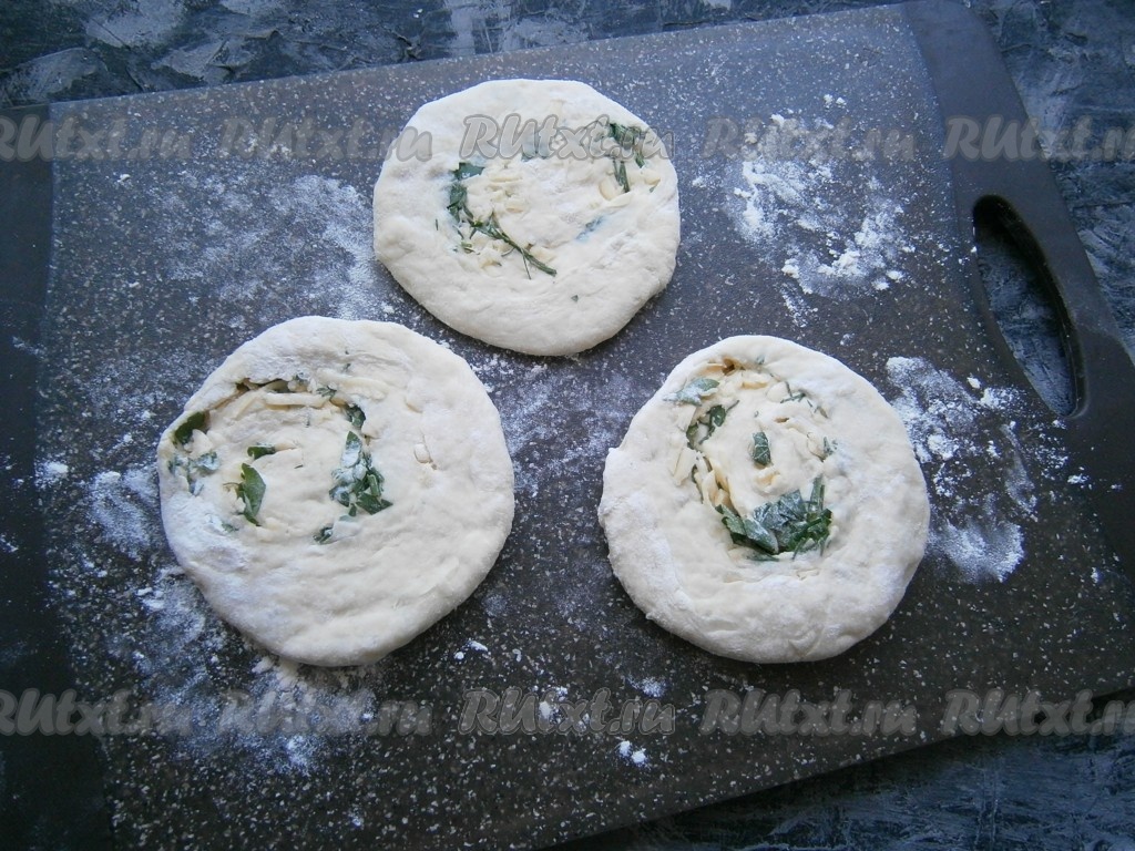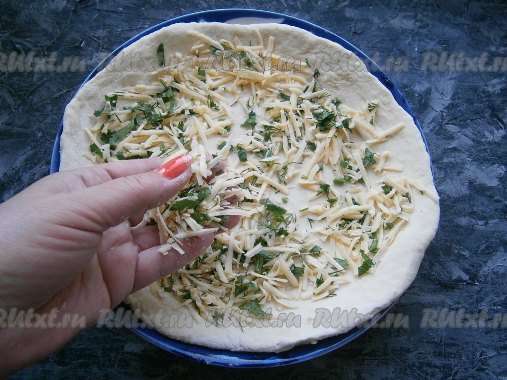 Немного обмять тесто смазанными растительным маслом руками. Для удобства разделить тесто на 2 части и каждую из частей раскатать в лепёшку толщиной, примерно, 0,5 см на подпылённом мукой столе. Посыпать каждую лепёшку половиной от общего количества сыра с зеленью.
