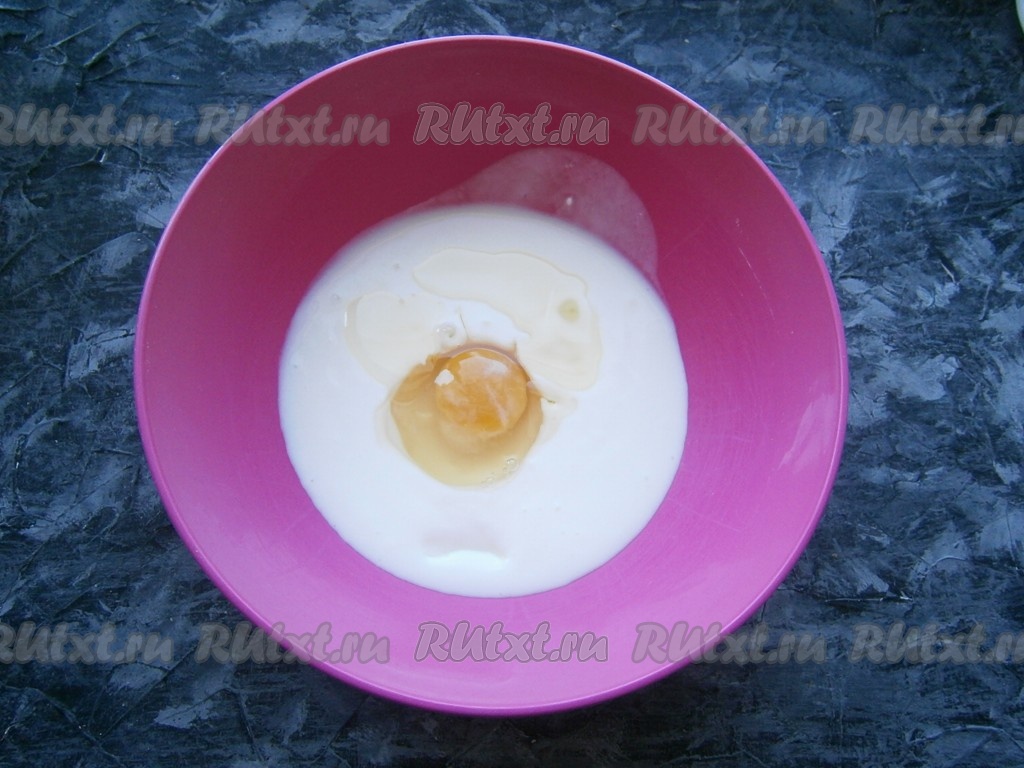 В кефир комнатной температуры вбить сырое яйцо, влить 1 столовую ложку растительного масла и всыпать соль.