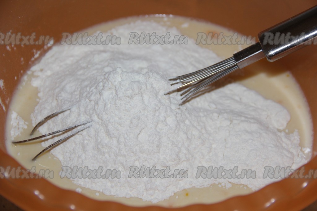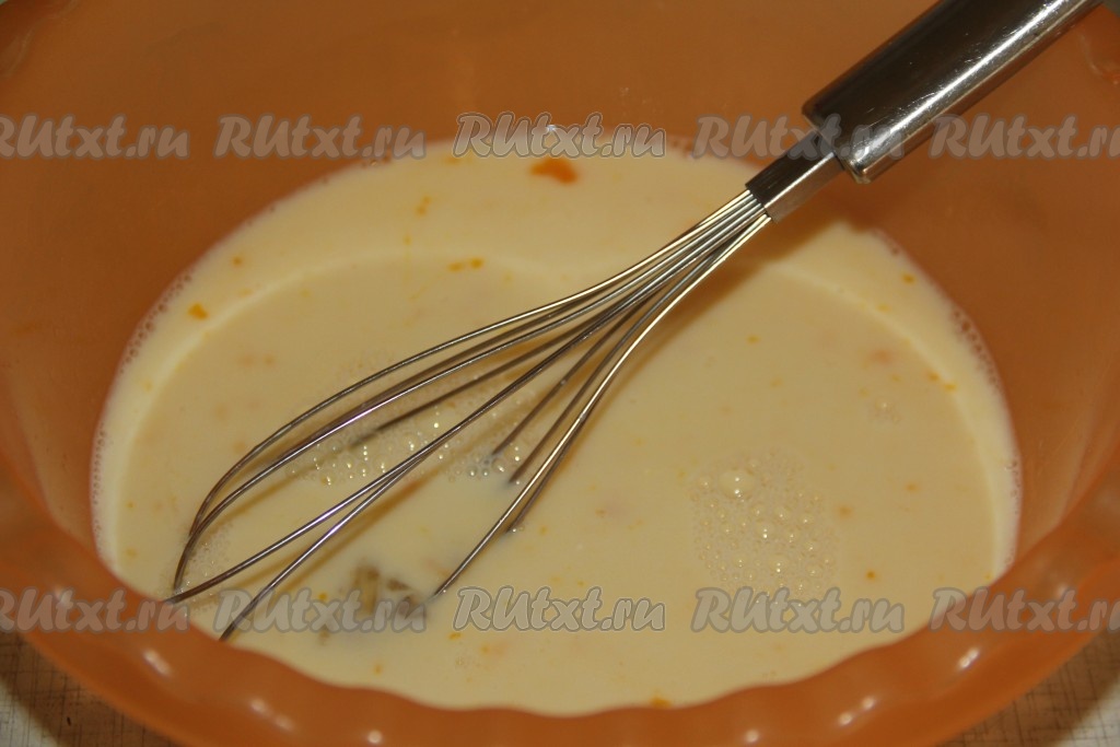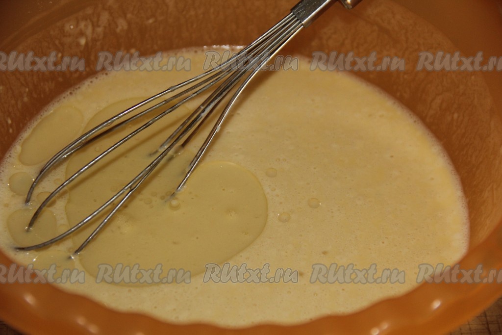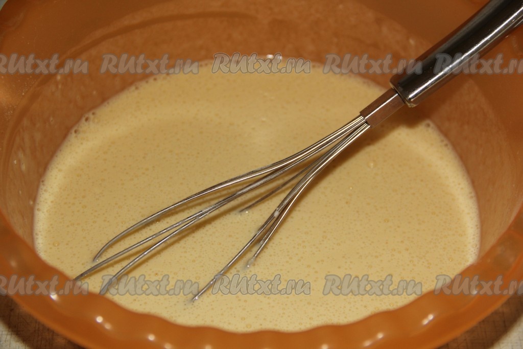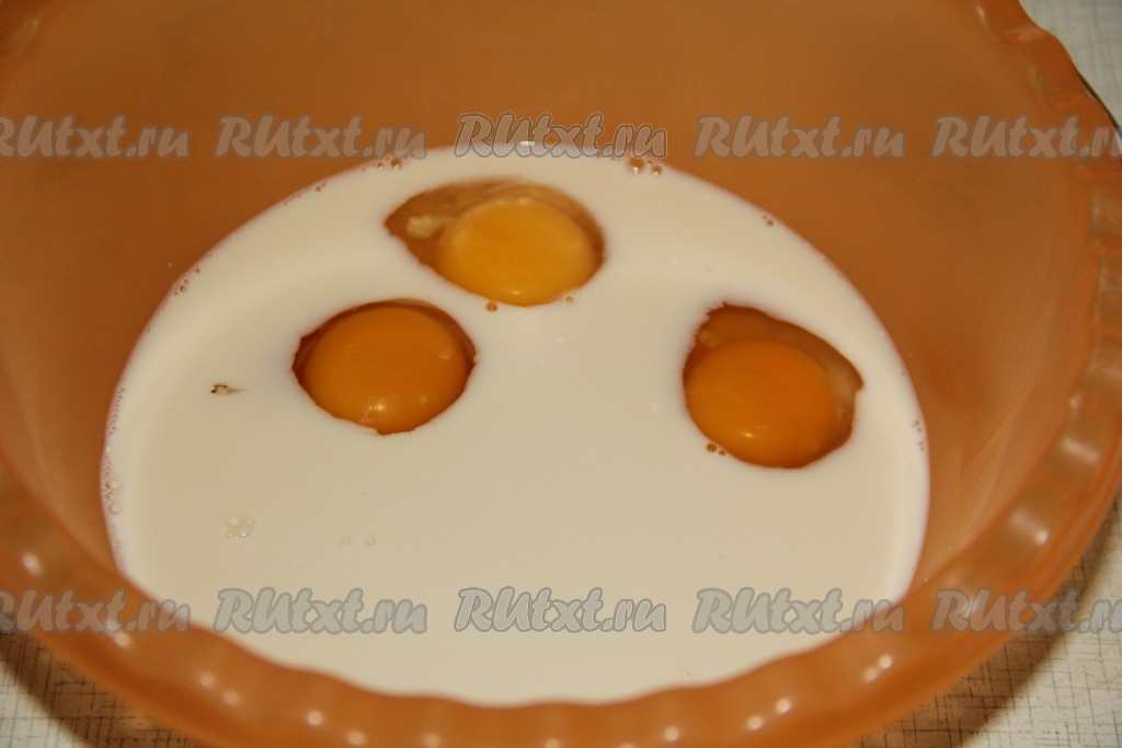 В глубокой миске соединить молоко и воду, перемешать венчиком, затем вбить яйца.