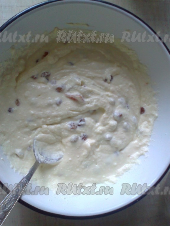 Изюм залить кипятком на 15 минут, затем воду слить, изюм обсушить и добавить в тесто.