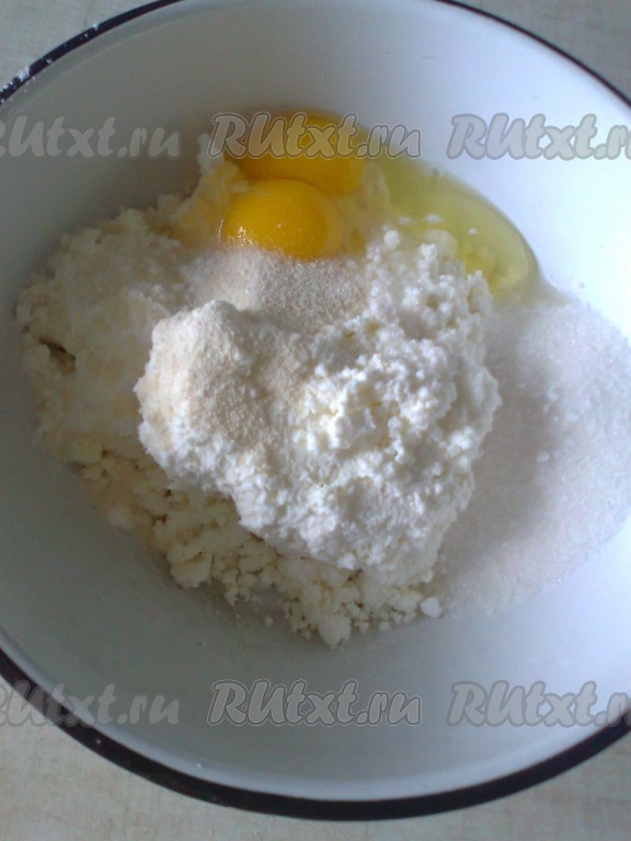 В творог добавить яйца, всыпать соль, сахар, ванильный сахар, разрыхлитель и манку.