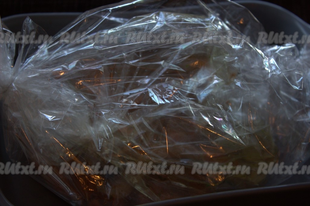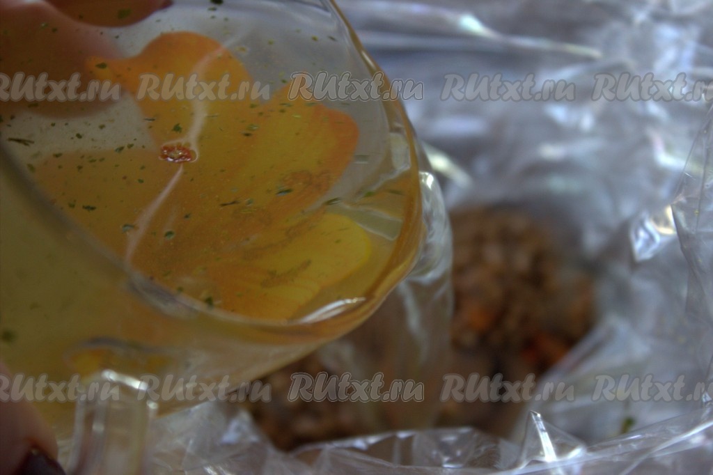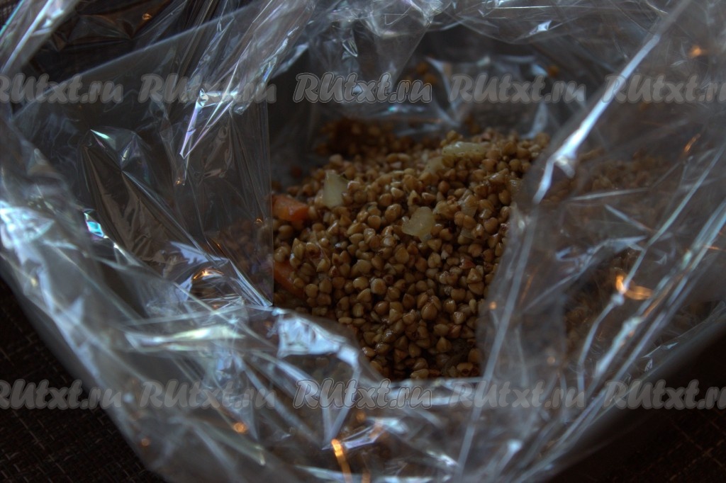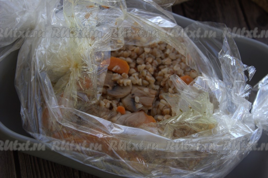 Рукав для запекания с одной стороны хорошо завязать. Выложить в рукав гречневую крупу, смешанную с овощами и шампиньонами (для надёжности наполненный рукав для запекания я поместила в ещё один рукав для запекания, но это необязательно).