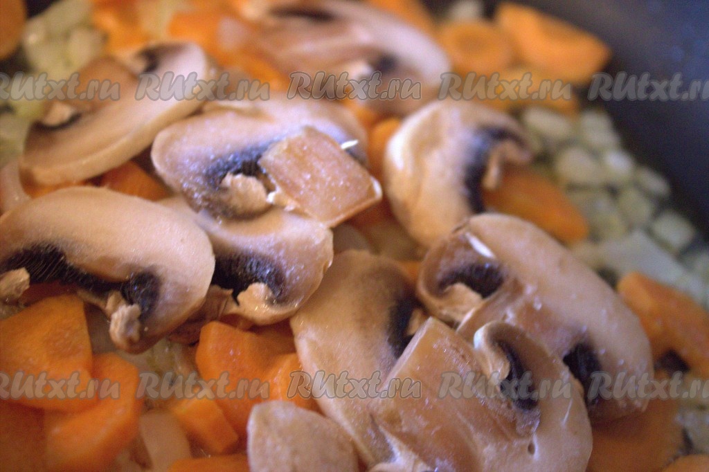 Шампиньоны вымыть, удаляя грязь, обсушить, нарезать на достаточно тонкие пластины (я использовала уже очищенные и нарезанные замороженные шампиньоны) и выложить в сковороду к луку и моркови, обжаривать на среднем огне, примерно, 7 минут, не забывая помешивать. В конце обжаривания немного посолить.