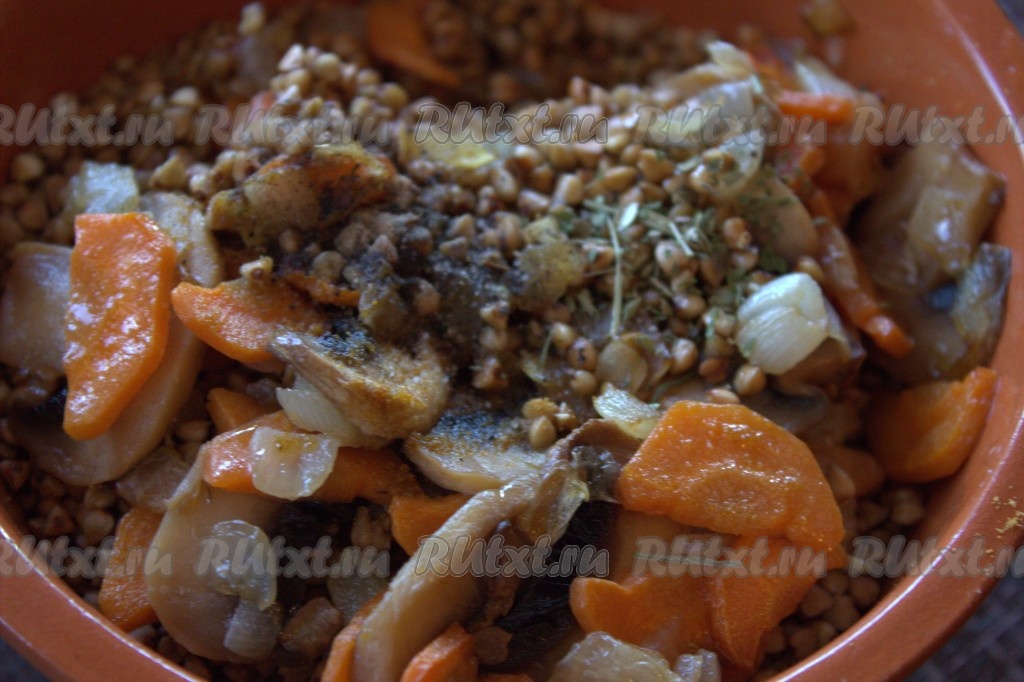 В миску с гречкой добавить шампиньоны, обжаренные с луком и морковью. Можно ещё немного посолить, приправить по вкусу (я добавила по щепотке молотого кориандра, молотого мускатного ореха и сушёной петрушки), тщательно перемешать.