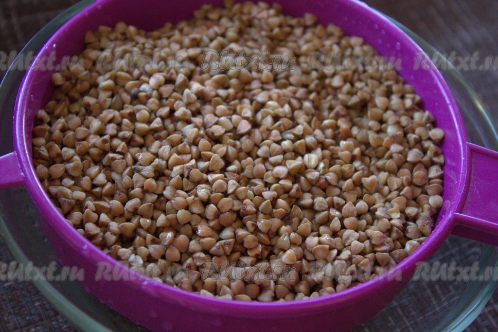 Гречневую крупу промыть под проточной водой, откинуть на сито, чтобы стекла лишняя жидкость (или выложить крупу на бумажное полотенце).