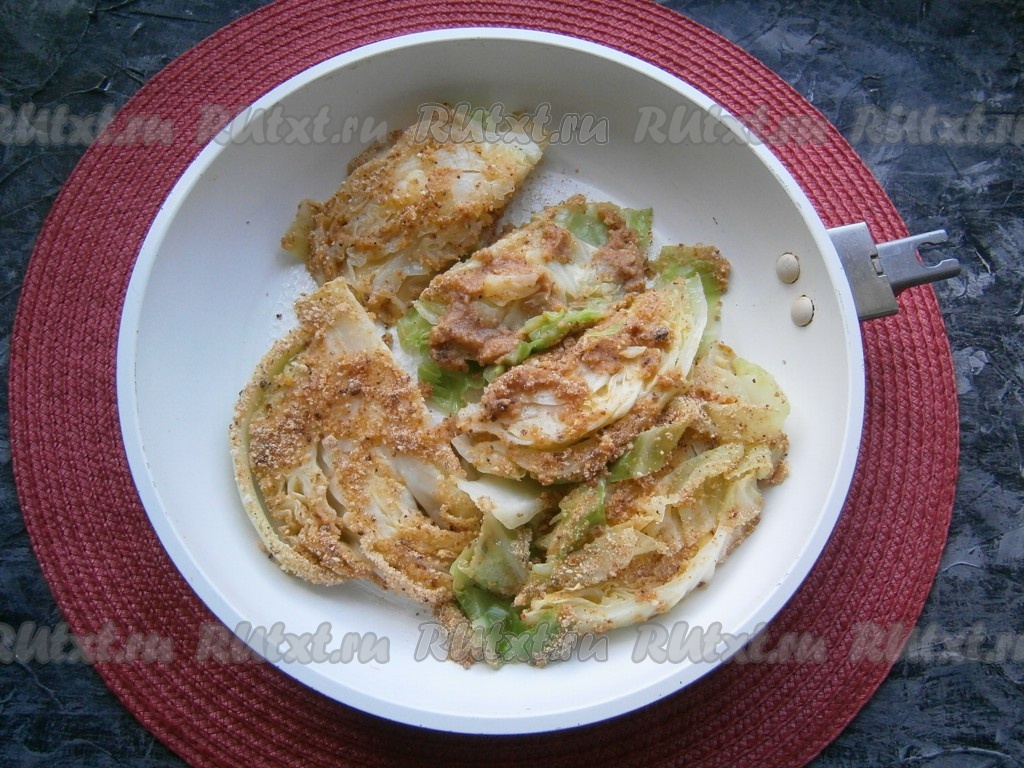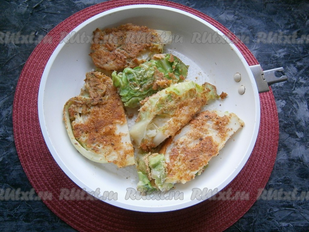Сразу же обвалять капусту в панировочных сухарях.