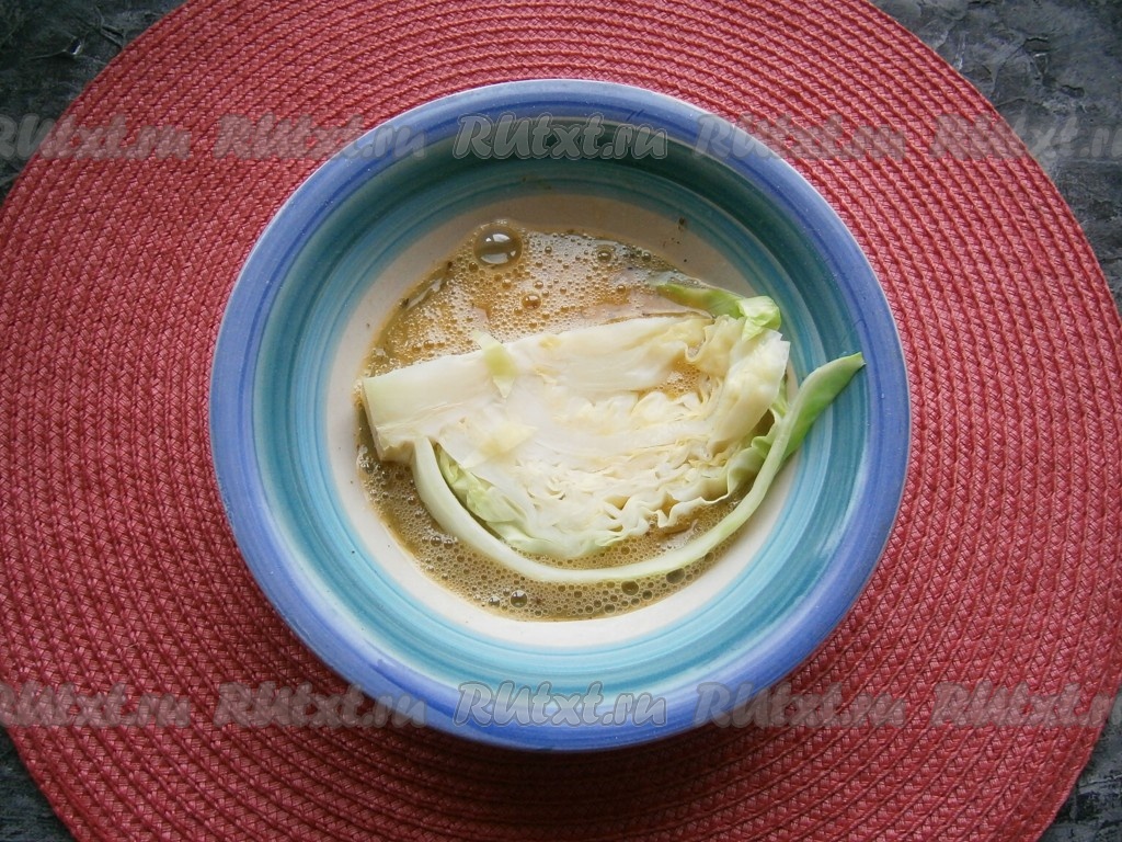 Тщательно взбить яйцо вилкой и обмакивать в него поочередно куски капусты с двух сторон.