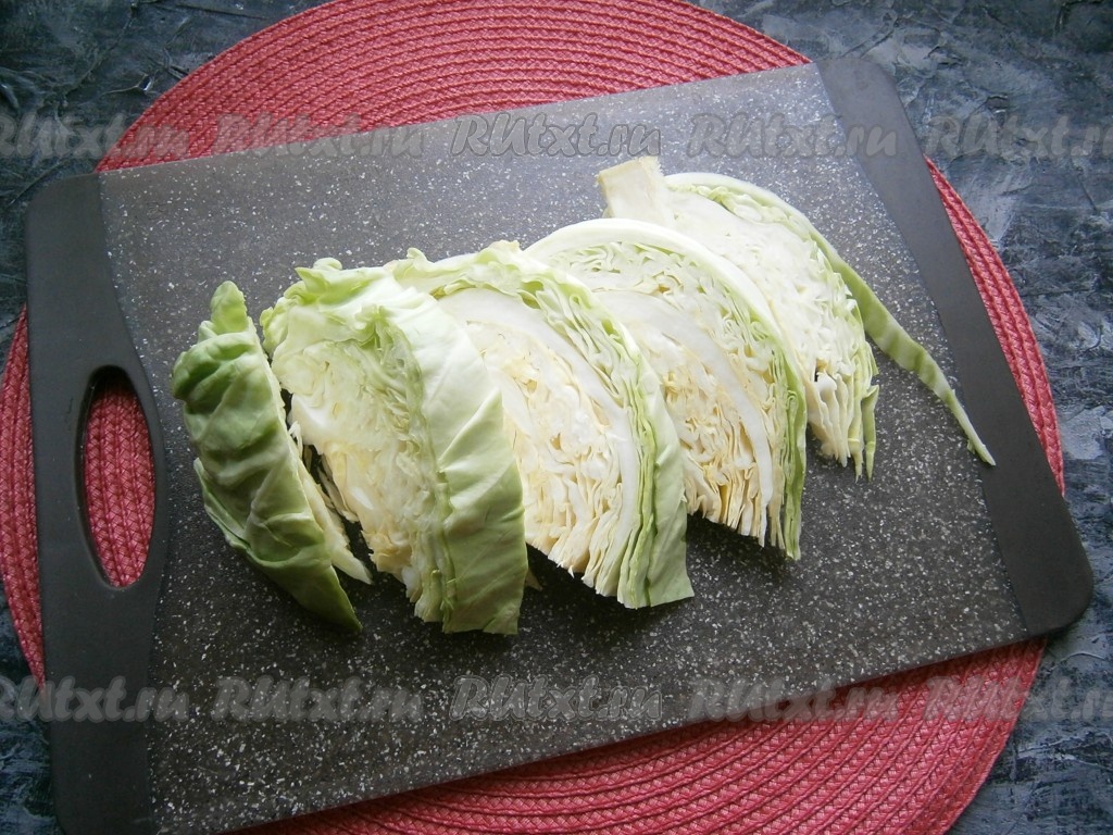 Половину кочана капусты нарезать кусками так, чтобы на каждом осталась часть кочерыжки. Таким образом она не распадётся.