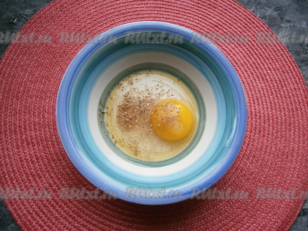 В пиалу (или миску) разбить яйцо, добавить щепотку соли, ароматные сухие травы и чёрный молотый перец.