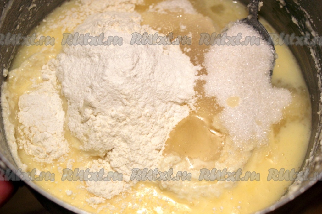 Затем добавить следующие ингредиенты: немного взбитые яйца, растительное масло, сахар и ванильный сахар, просеянную муку, разрыхлитель и соль.