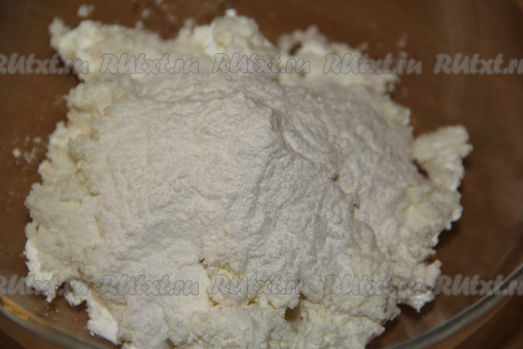 Творог соединить с сахаром, пробить погружным блендером до получения однородной творожной массы.