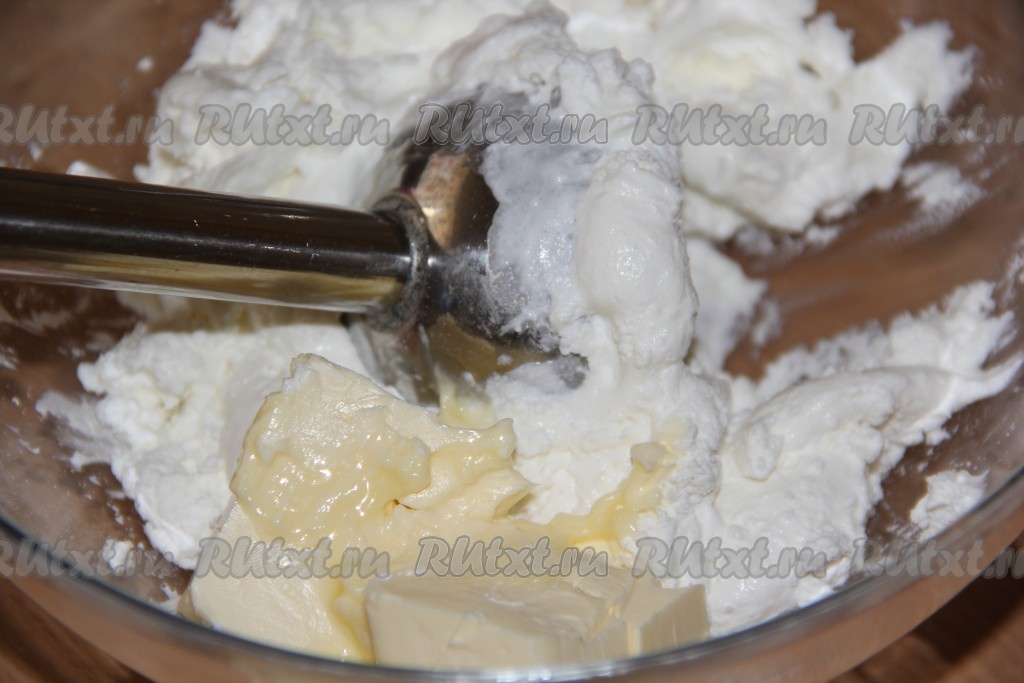 Добавить мягкое сливочное масло в творожную массу и снова пробить блендером до однородности.