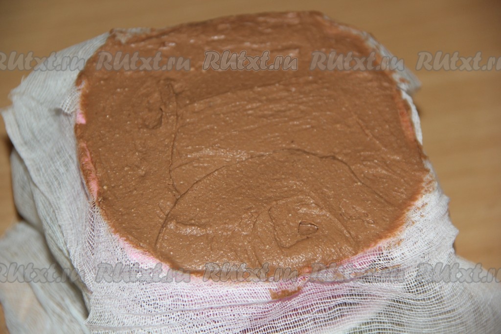Переложить творожно-шоколадную массу в форму. Накрыть массу свисающими концами марли и поставить сверху гнёт (в качестве гнёта можно поставить поверх пасхи, накрытой марлей, небольшую тарелочку и банку с водой). Поставить форму с грузом в холодильник и оставить на 10-12 часов.