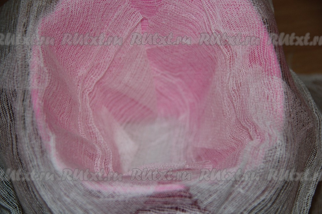 Масса хорошо застынет. Убрать марлю, закрывающую пасху, и перевернуть пасху на плоскую тарелку, снять марлю.