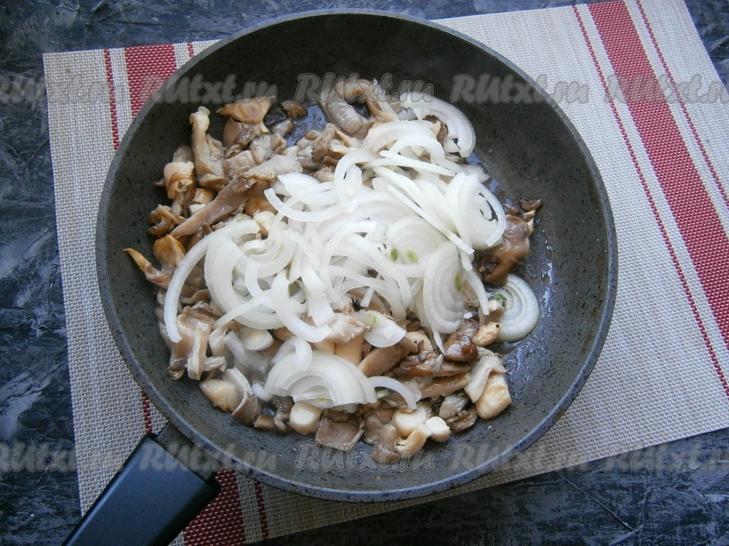 Обжарить грибы, помешивая, на среднем огне до тех пор, пока они не начнут зарумяниваться (5-6 минут), далее добавить к ним почищенный и нарезанный тонкими полукольцами лук.