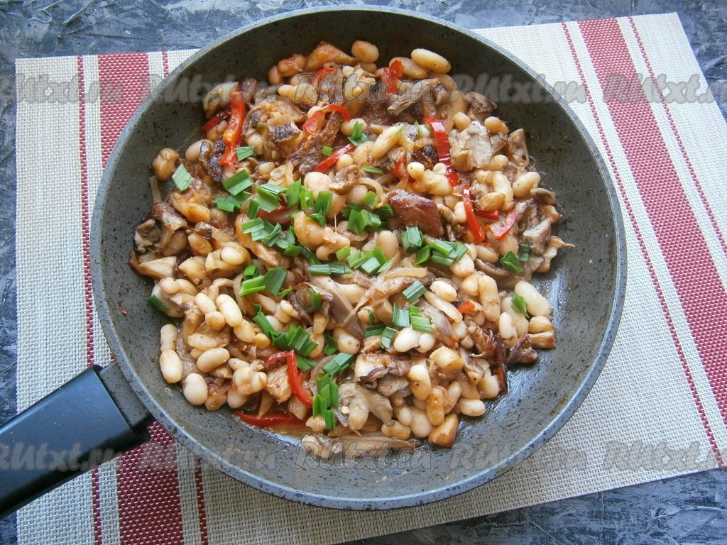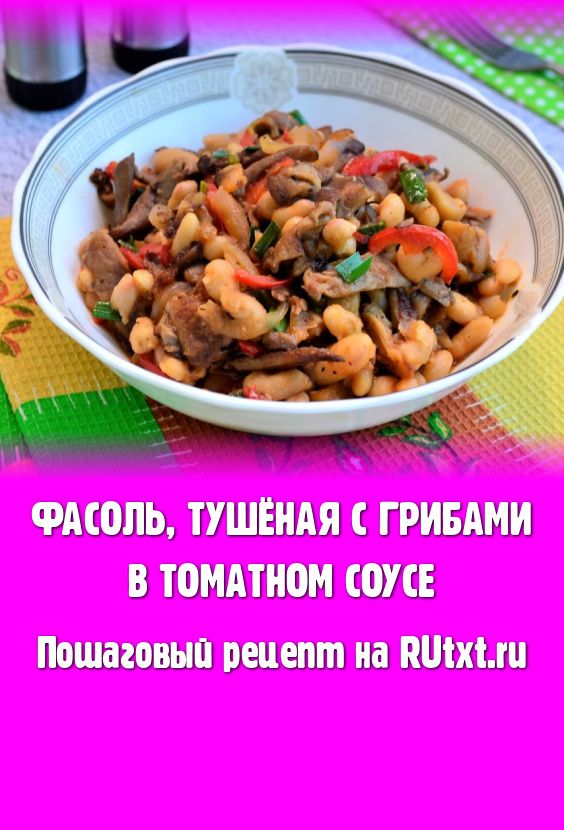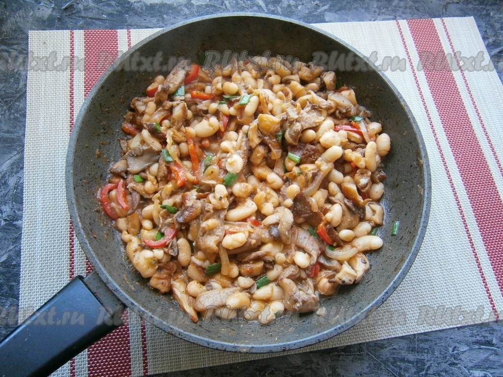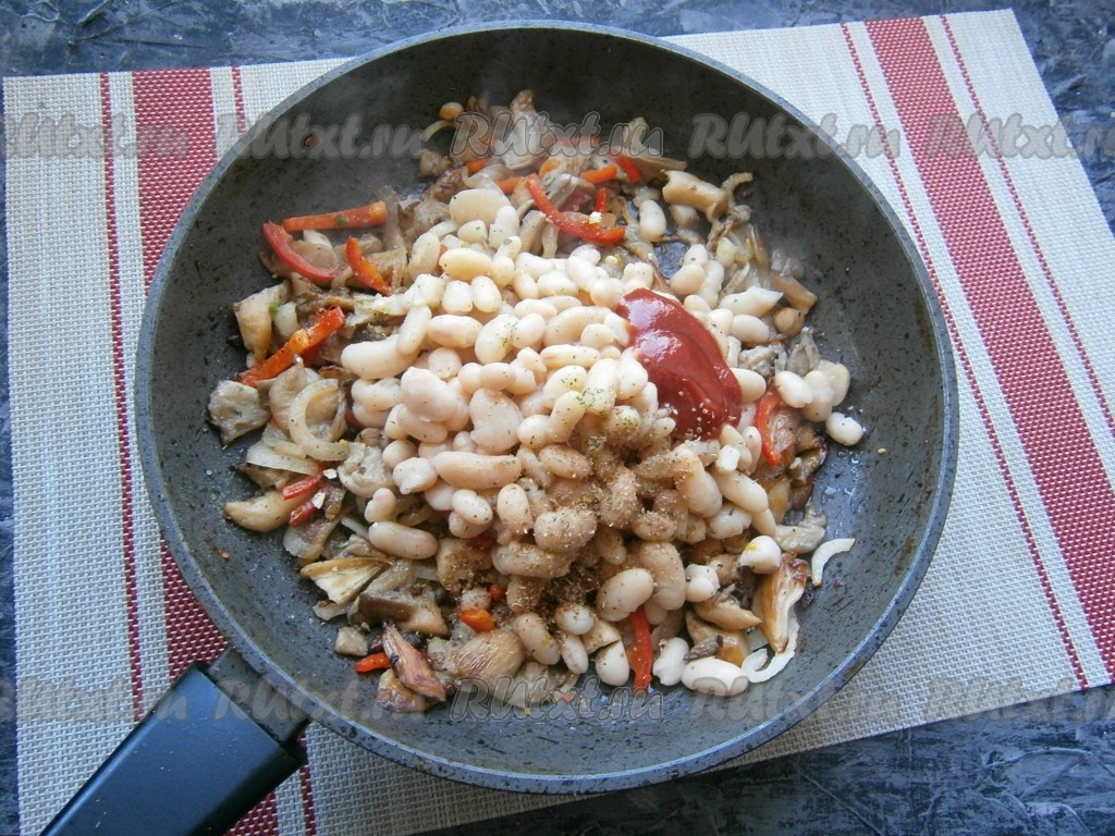 Добавить отваренную (или консервированную) фасоль к грибам. Сюда же добавить томатный соус и ещё немного специй по вкусу.