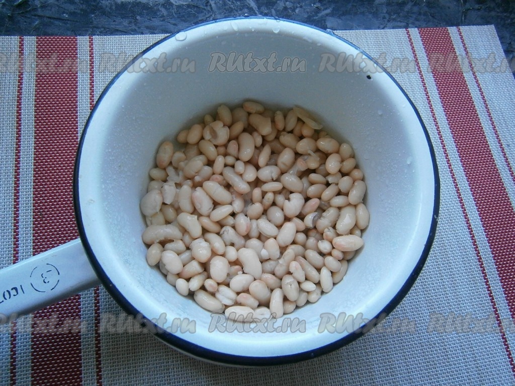 Если вы готовите это блюдо с сухой фасолью, тогда предварительно отварите её, для этого залейте фасоль холодной водой на ночь, затем залейте её чистой водой и отварите её с момента закипания на небольшом огне в течение 25-50 минут - в зависимости от сорта фасоли. Белая фасоль варится быстрее, поэтому лучше брать её. Варить фасоль нужно в несолёной воде, соль добавляется в конце варки. Отваренную фасоль откинуть на сито (или дуршлаг), чтобы стекла лишняя вода. Если вы готовите с консервированной фасолью, то её нужно промыть водой, используя дуршлаг, а затем дать стечь лишней жидкости.