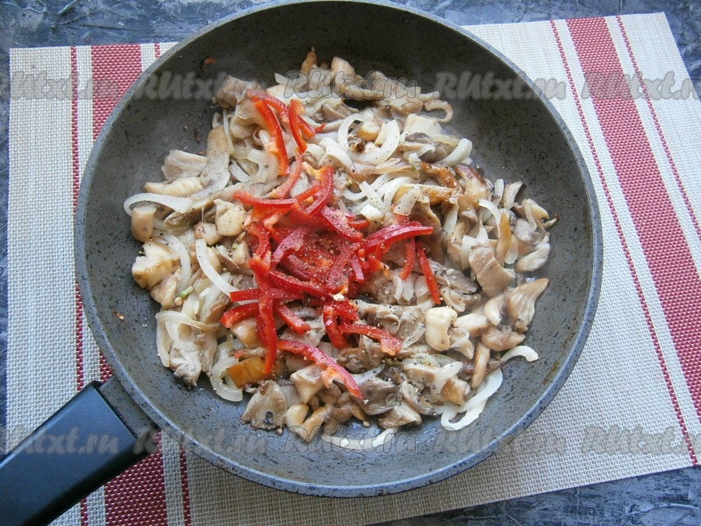 Сюда же добавить и нарезанный соломкой болгарский перец, соль, специи и чёрный молотый перец, перемешать и обжаривать, перемешивая, минут 5.