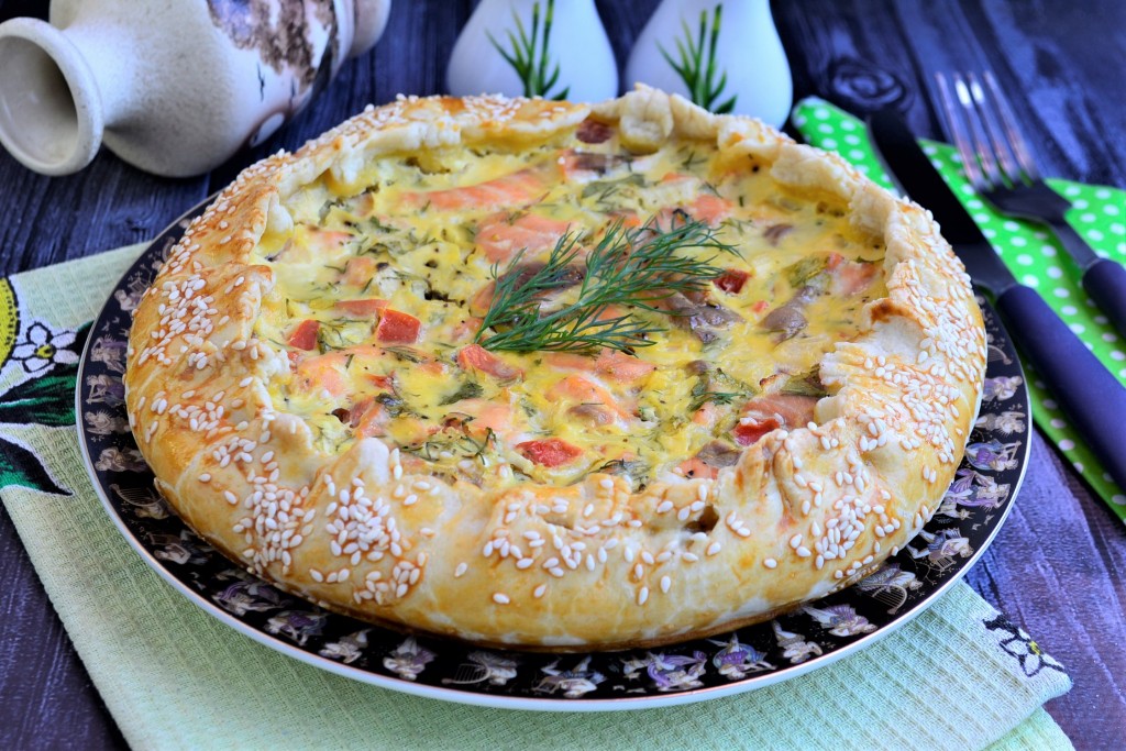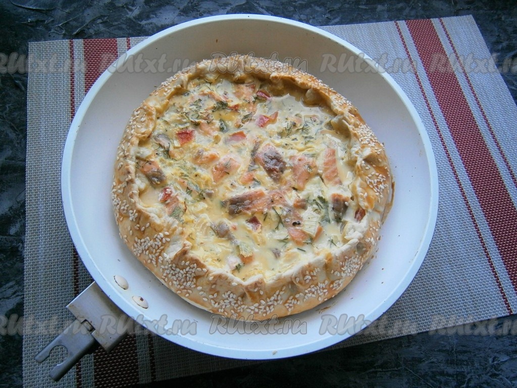 Выпекать рыбный песочный пирог в предварительно разогретой до 190 градусов духовке около 35 минут.