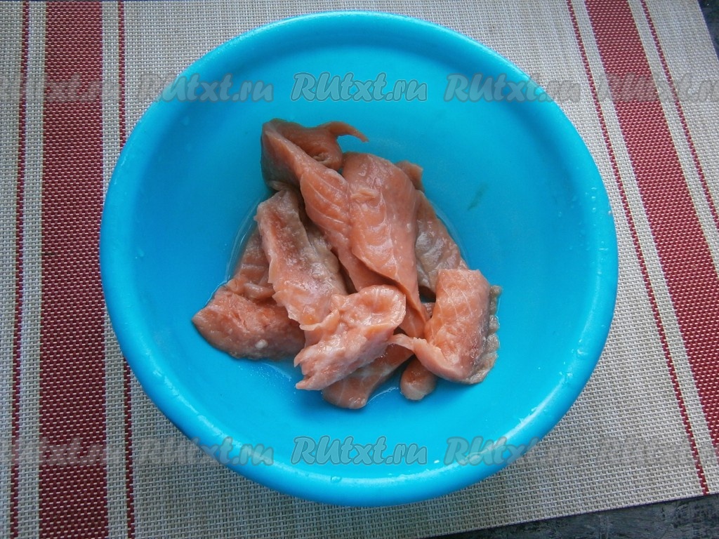 Приготовить начинку для пирога: филе рыбы разморозить (если было заморожено), промыть, удалить (если есть) кости.