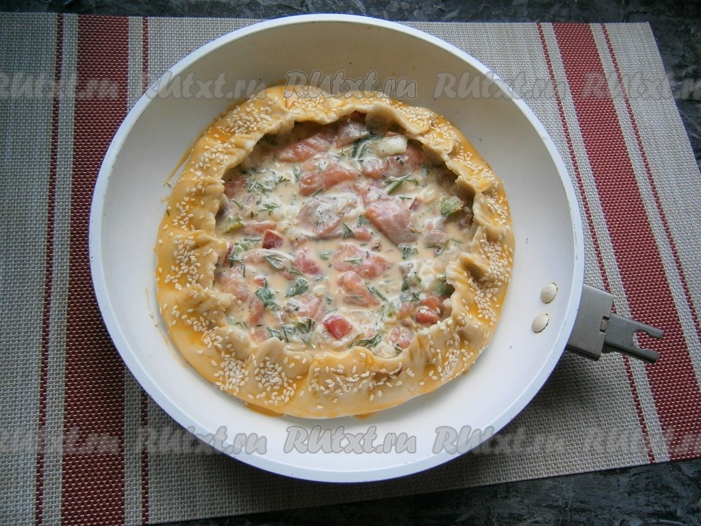Достать песочное тесто из холодильника, раскатать его в лепёшку больше диаметра вашей формы на 4-5 см. Переложить лепёшку в форму для выпечки (я вместо формы для выпечки использовала сковороду без ручки диаметром 24 см). Наколоть лепёшку вилкой и выложить в середину начинку. Края завернуть на начинку и защипнуть по типу галеты. Смазать верхнюю часть теста (завернутый ободок) желтком и посыпать кунжутом.