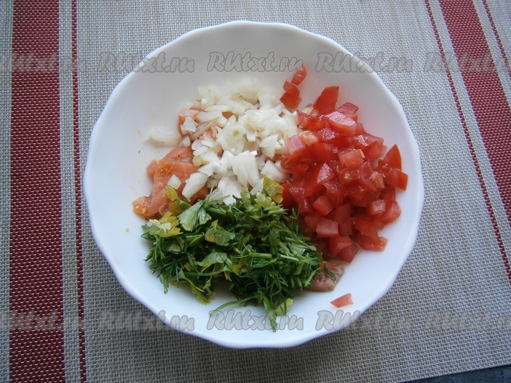 Рыбу перемешать и оставить на 10 минут. Далее добавить к рыбе очищенный и мелко нарезанный лук, измельчённую зелень укропа и петрушки, нарезанный небольшими кусочками свежий помидор.