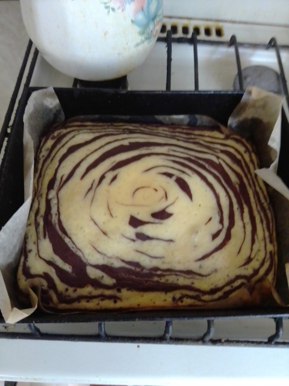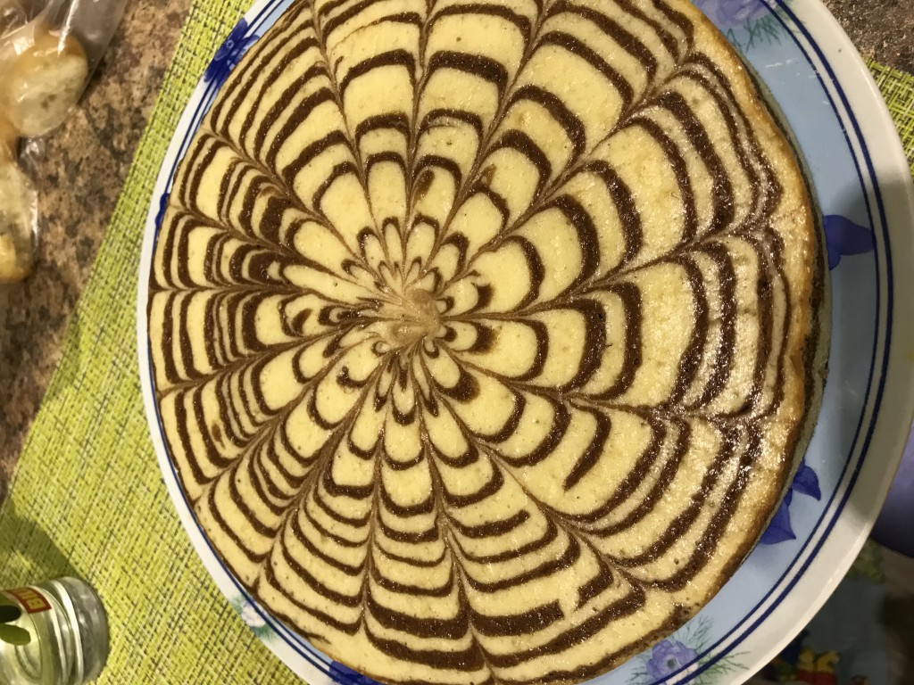 Пирог "Зебра" выпекать минут 40-45 в разогретой до 180 градусов духовке (готовность проверьте, проколов выпечку сухой зубочисткой - если пирог готов, зубочистка останется сухой).