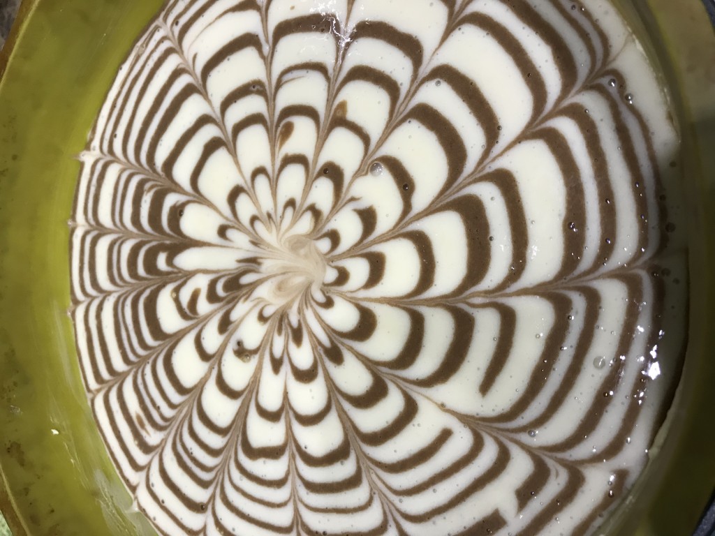 Затем 2 столовые ложки светлого теста выложить в центр формы. Поверх светлого теста выложить в центр формы 2 столовые ложки тёмного теста. Чередуя светлое и тёмное тесто, в центр формы выкладывать по 2 столовые ложки теста.
