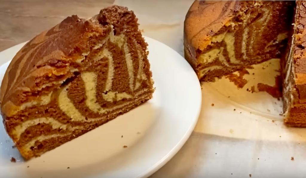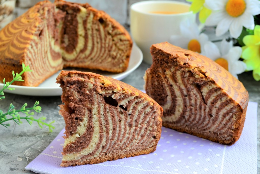 Дать пирогу немного остыть в форме, а затем вынуть его и полностью остудить на решётке. Шикарный, очень вкусный пирог "Зебра", приготовленный на молоке в духовке, можно разрезать на части и подавать к столу. Как видно на фото, полосы (рисунок) получились достаточно чёткими.