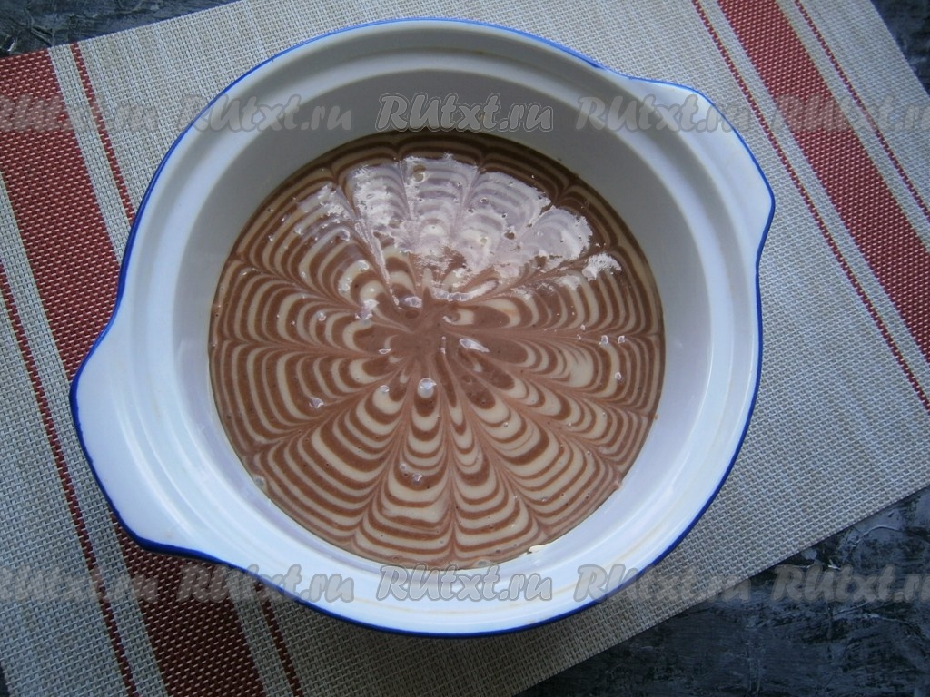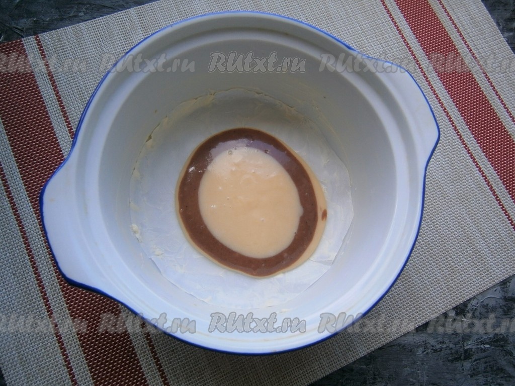 Каждое тесто перемешать до однородности (получится 2 вида теста - светлое и тёмное). Дно любой круглой формы диаметром 19-20 см застелить пергаментом, хорошо смазать всю форму сливочным маслом. В центр формы выложить 1 столовую ложку светлого теста, затем поверх светлого теста в центр формы выложить 1 столовую ложку тёмного теста, сверху снова выложить 1 столовую ложку белого теста. Таким образом, чередуя, продолжать выкладывать по 1 столовой ложке тёмное и белое тесто в центр формы. Чтобы в последствии у пирога был более чёткий рисунок в разрезе, ложкой, выкладывая тесто, нужно касаться дна формы.